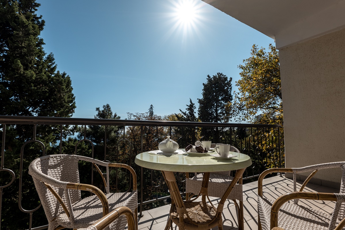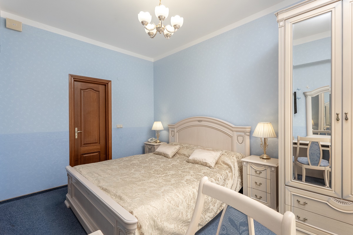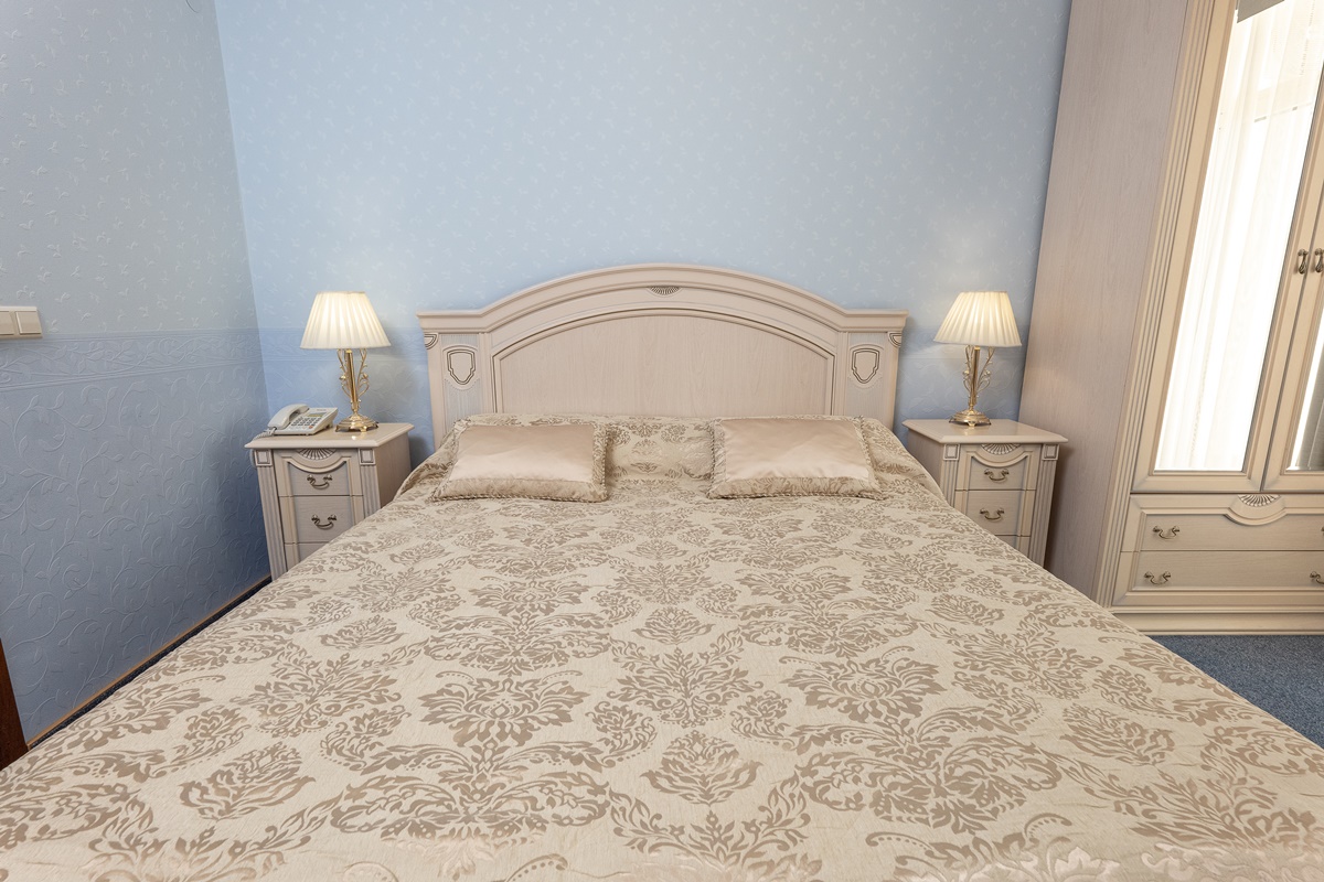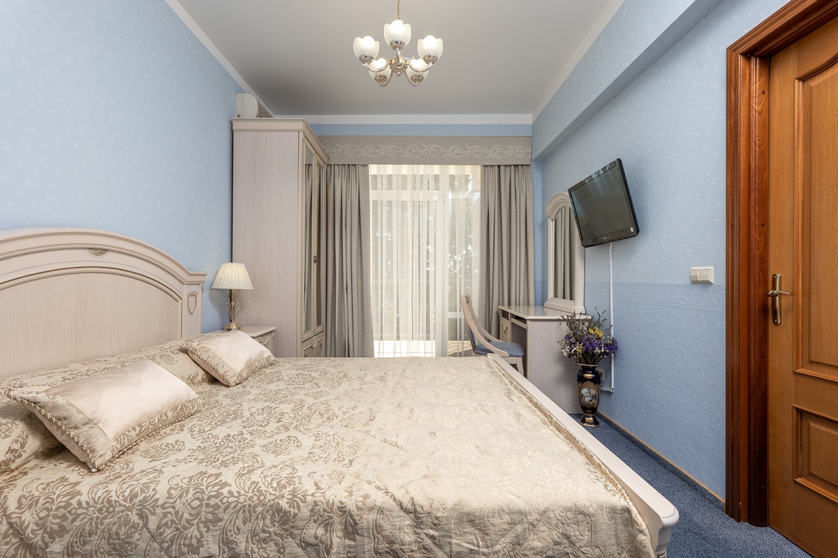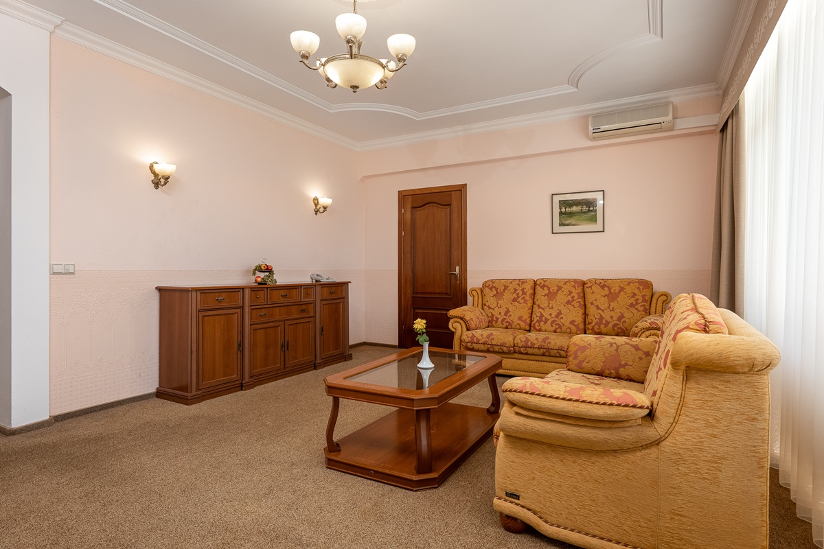 Площадь номера - 58 кв.м. 2 осн. места. 2 доп. места. Балкон. Мебель: диван раскладной, зеркало, кресла, кровать двуспальная, набор мягкой мебели, прикроватные тумбочки, стулья, шкаф. Оборудование: пляжные полотенца, сейф, сплит-система, телевизор, телефон, холодильник, чайный набор посуды. Санузел: 2 санузла, с ванной и душевой кабиной, тапочки, туалетные принадлежности, фен, халат. Сервис: Wi-Fi бесплатно, смена полотенец (1 раз в 3 дня), смена постельного белья (1 раз в 3 дня), уборка номера (ежедневно), услуги внутренней телефонной связи.
