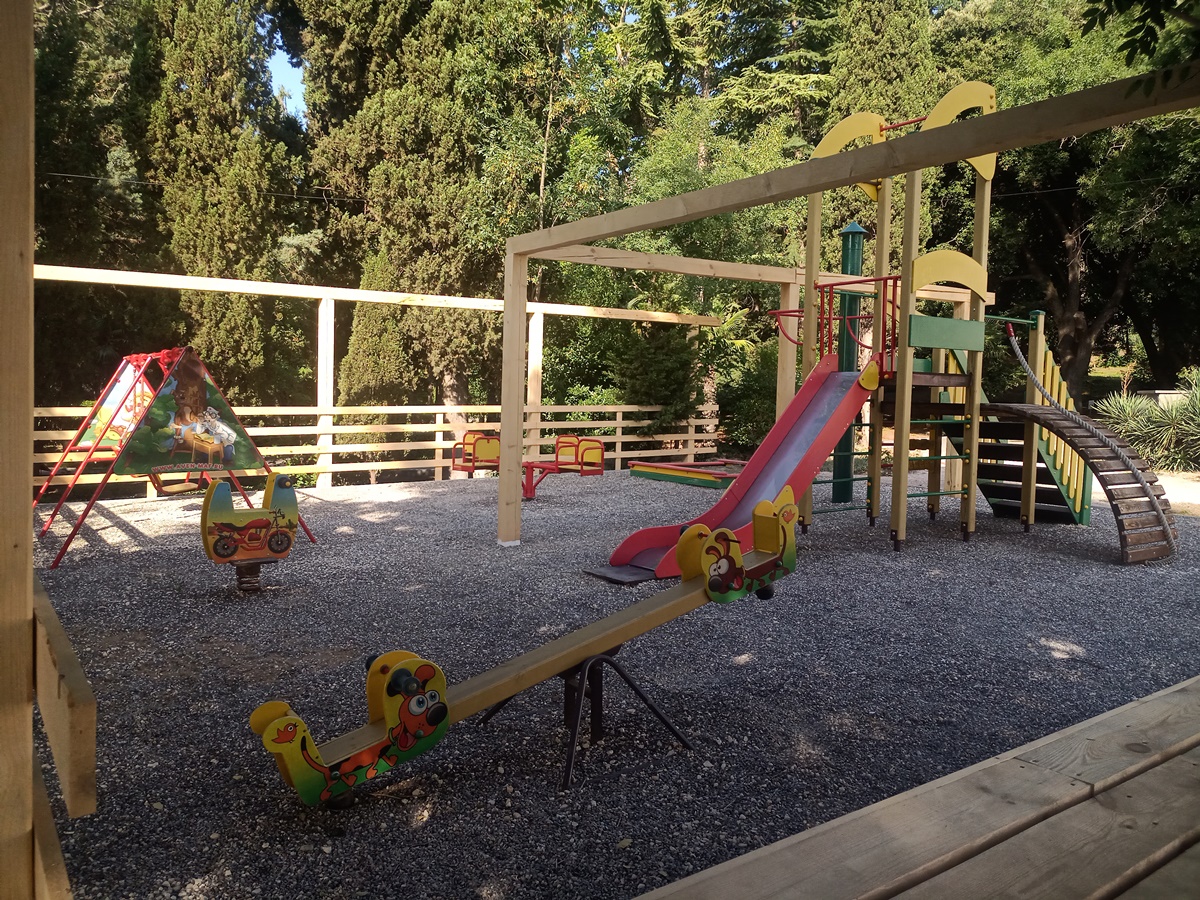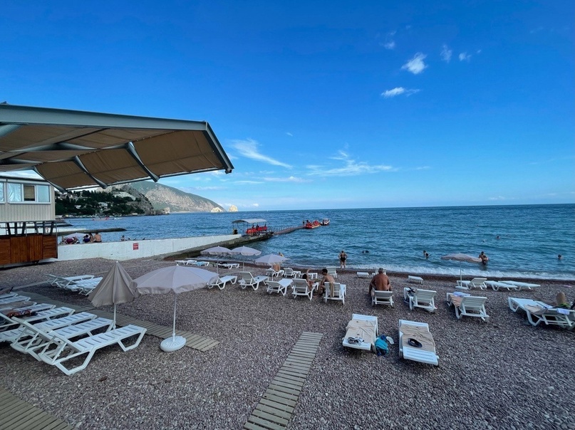 Пляж мелкогалечный, оборудованный теневыми навесами, лежаками, шезлонгами, кабинками для переодевания, туалетом.